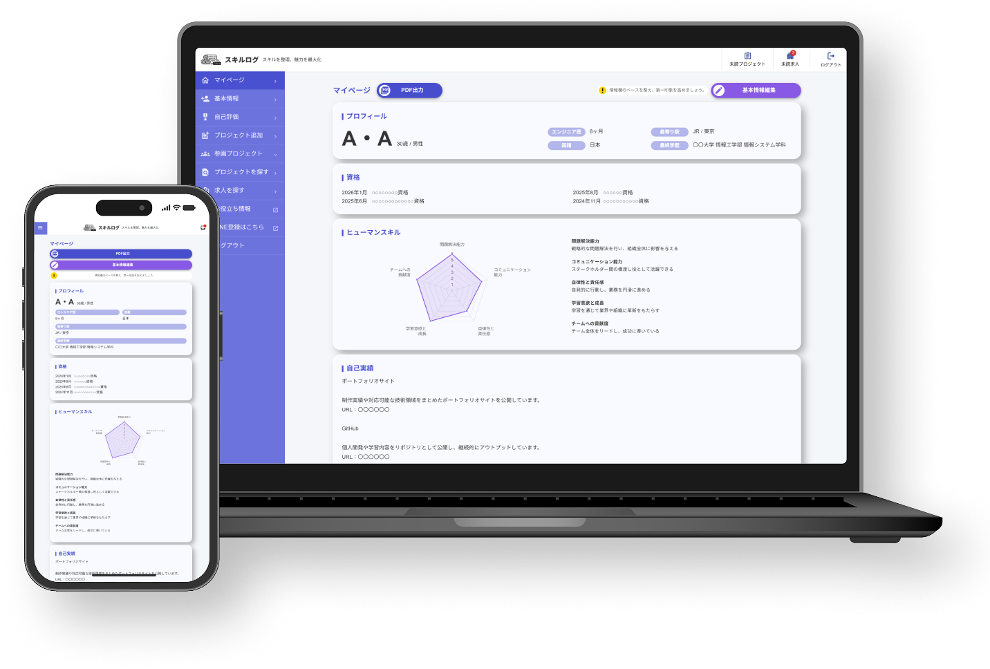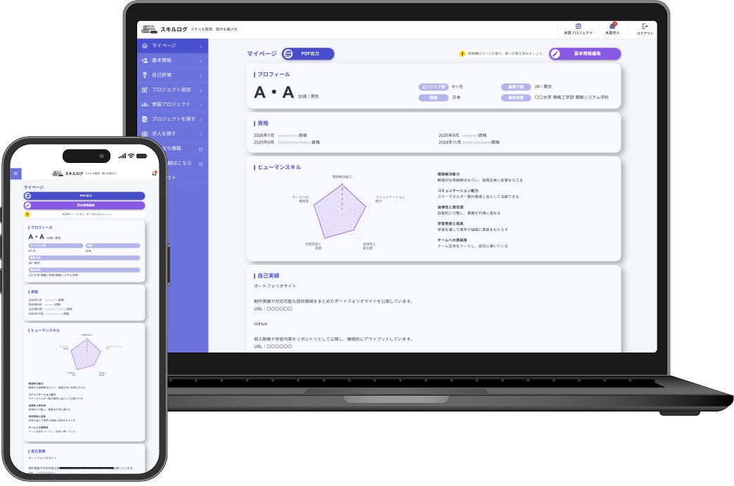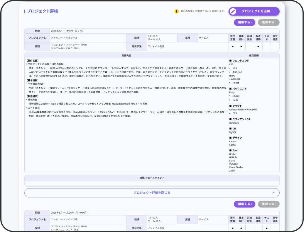 プロジェクトごとに「期間・体制・役割・使用技術」などを入力するだけで、スキルログ側で情報を自動で整理し、採用選考で評価されやすいレイアウトのスキルシートとして出力されます。