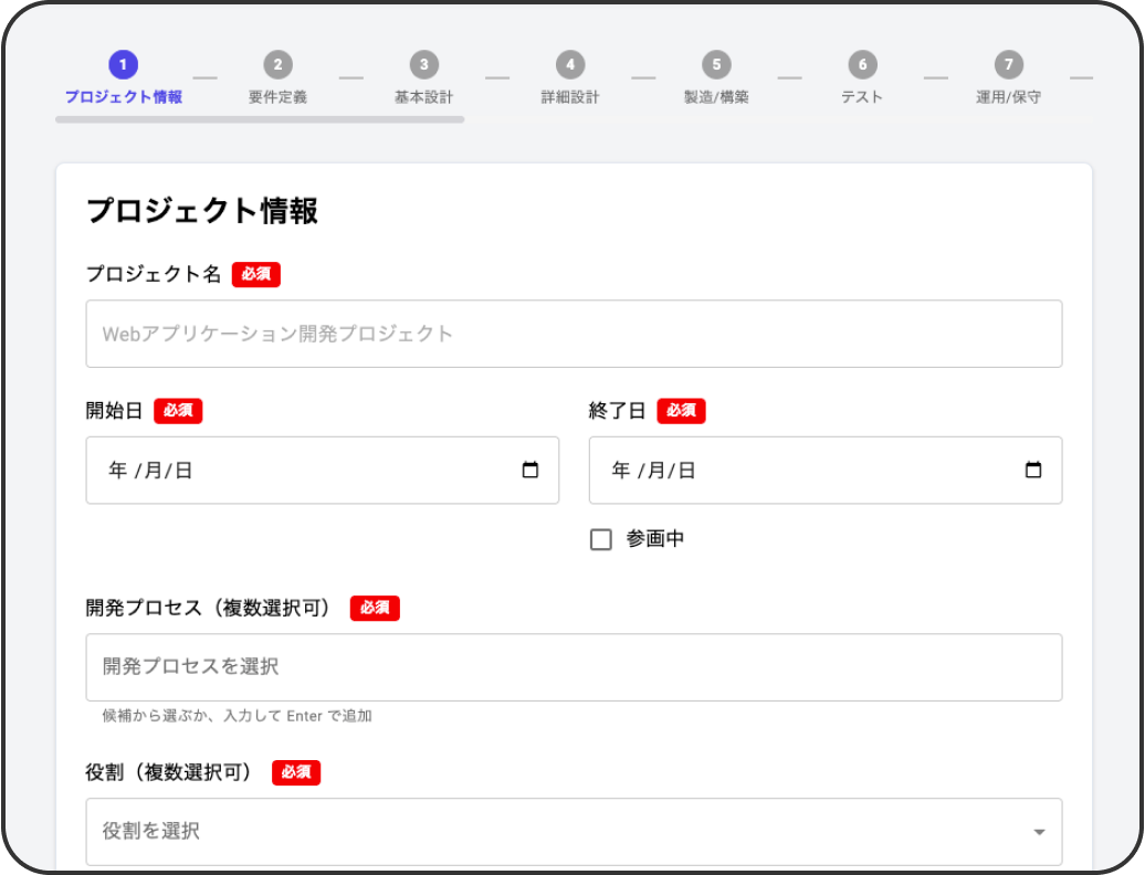 まとめてでも書きやすいフォーム業務内容を細かく分類したステップ式の入力フォームで、プロジェクトごとにまとめて記入しやすい設計です。